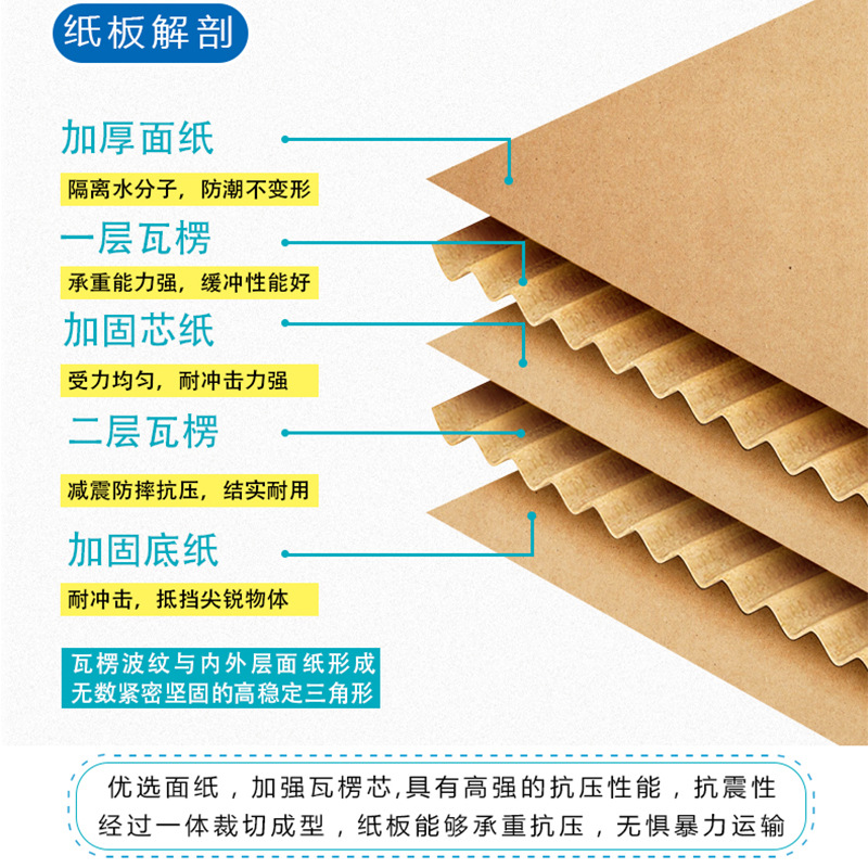 瓦楞纸板是由面纸、里纸、芯纸和加工成波形瓦楞的瓦楞纸通过粘合而成。根据商品包装的需求,瓦楞纸板可以加工成单面瓦楞纸板、三层瓦楞纸板、五层、七层、十一层等瓦楞纸板。