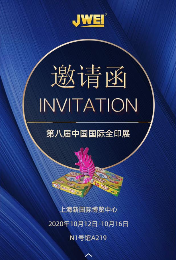 尊敬的嘉宾:您好!我们诚挚邀请您参加于2020年10月12 日在上海举行的,第八届中国国际全印展。本次展会经纬将携印刷包装行业最新裁切解决方案出席。共同探讨印刷包装行业发展之路的机遇和挑战,届时,我们还准备了礼品,精彩活动等您品鉴。