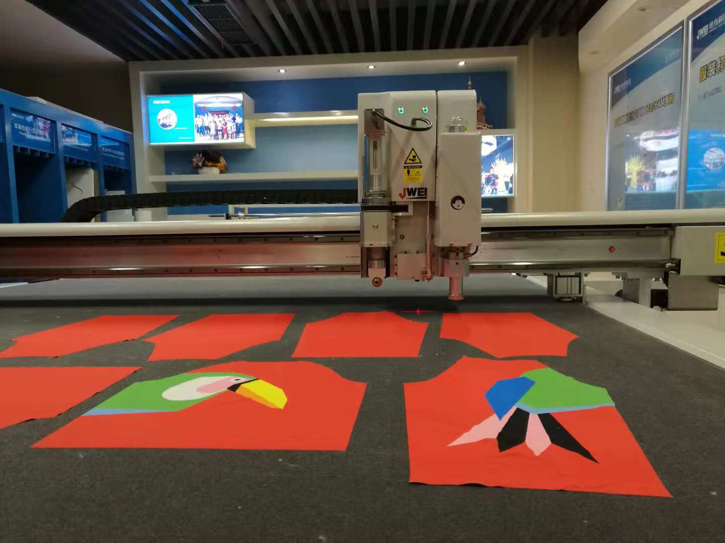 经纬无纺布袋切割机采用双机头设计,可根据所需材料简易的更换工具,配有摄像头定位系统,针对于印花布料可自动巡边裁切;滚动式平台,可自动送料自动裁切,全程自动化,无需人守。
