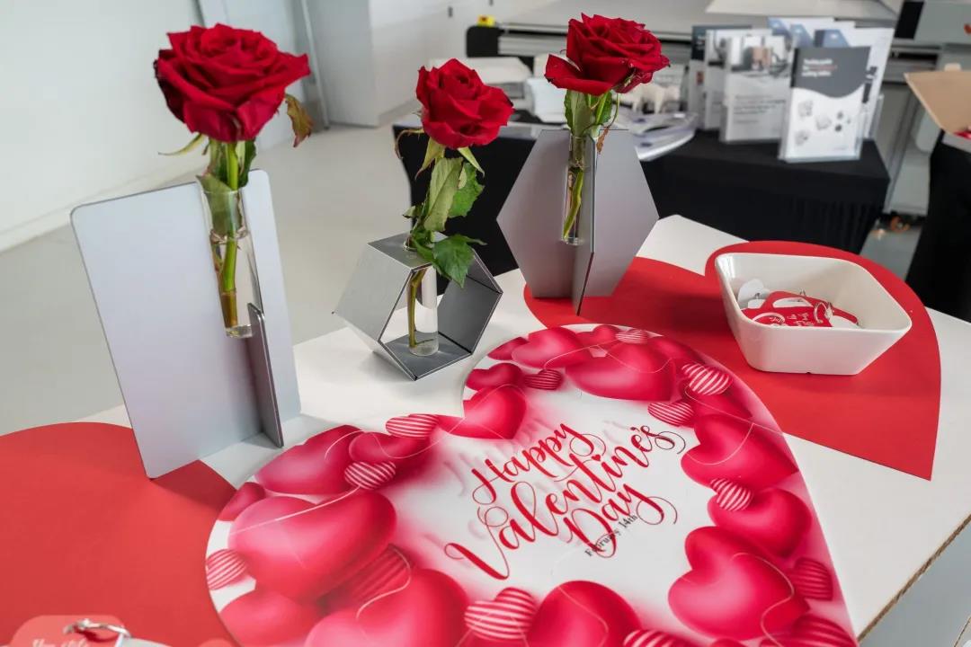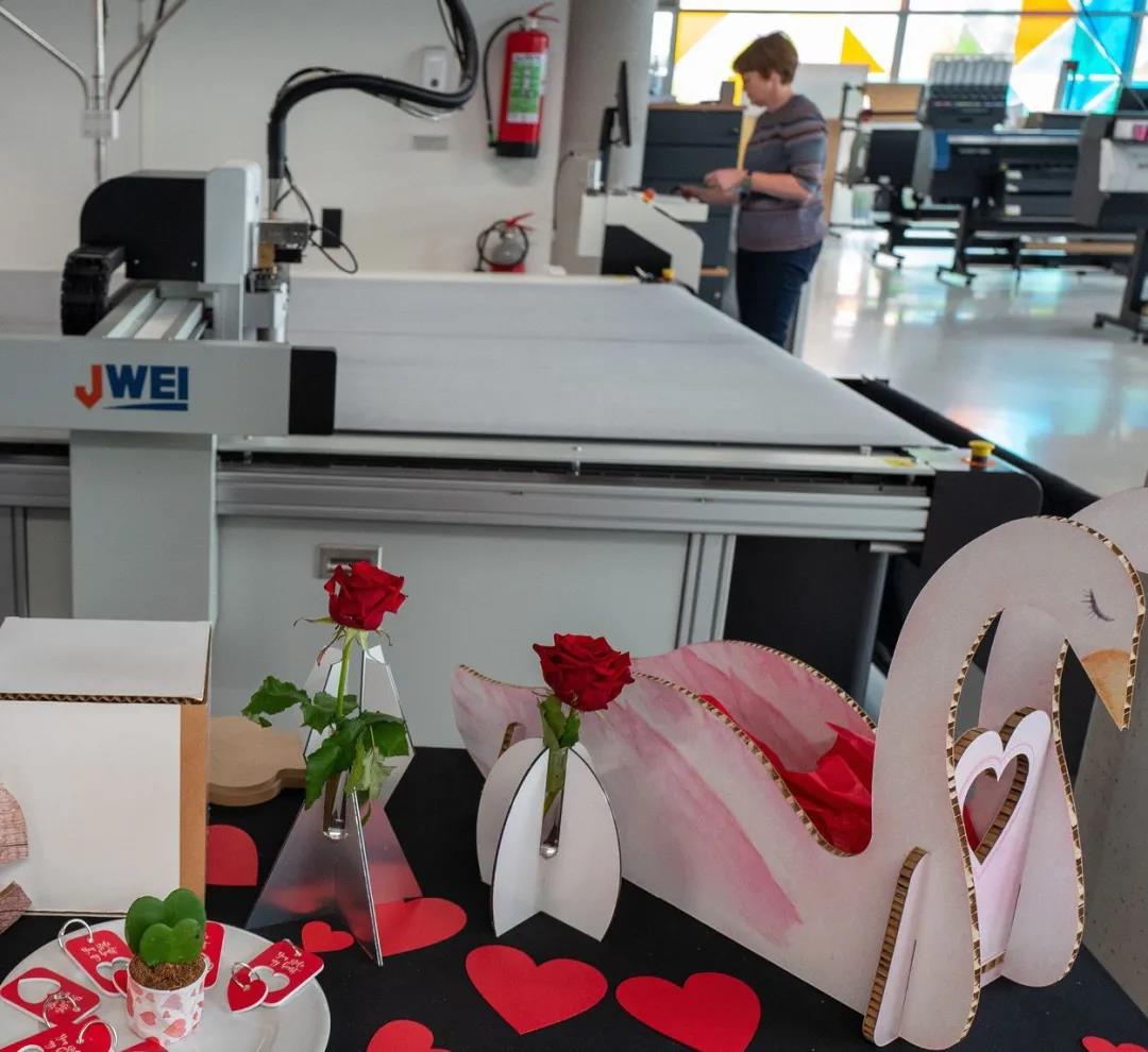 图为Igepa分公司利用经纬切割机裁切产品,打造情人节氛围现场。