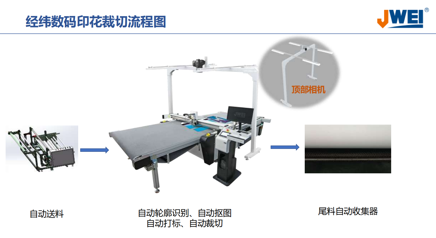 通过经纬服装裁剪设备的自动送料到服装裁剪设备的台面上,在有顶部相机进行拍照生成轮廓线稿图,定位快速进行图案裁剪,打剪口,自动收料,全程自动化,仅仅需要一台服装裁剪设备,即可降低生产成本、损耗,提升服装的质量度,采用刀片是裁剪,不烧焦,无发黄,很好的满足当地环保需求。
