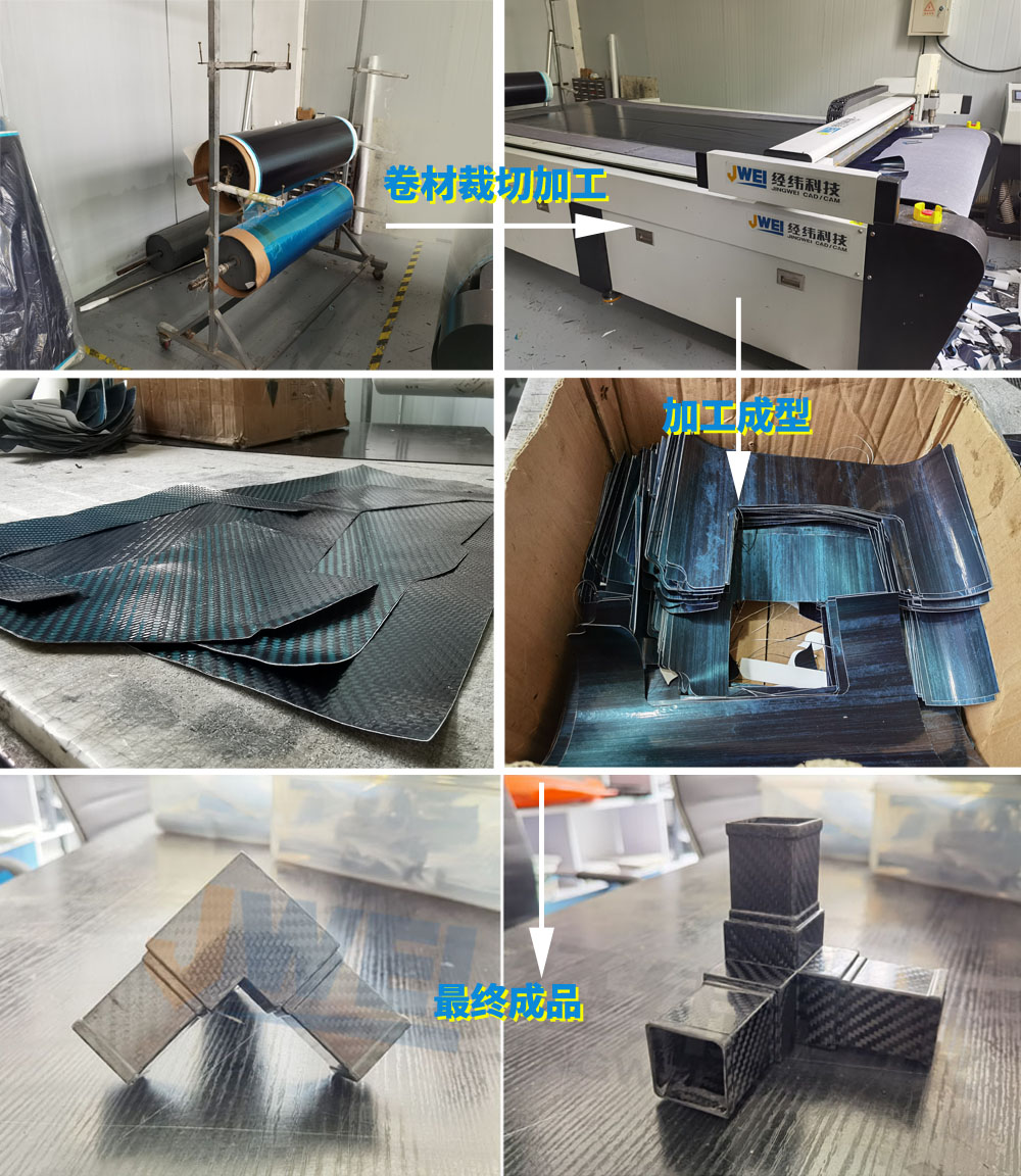 经纬复合材料下料机是一款全自动型的异形裁切设备,专门用于各种类型复合材料的加工,如碳纤维布、预浸料布、合成树脂、橡胶、石墨、碳、玻璃纤维、碳纤维、硼纤维、芳纶纤维、碳化硅纤维、石棉纤维等材料,采用圆刀工具以及震动刀工具切割,不管是柔软的还是硬质材料,均可快速加工成所需要的形状。经纬复合材料下料机有自动送料、自动打标、自动切割、自动收料的功能,全程无需人守,节省人工,增加效率。