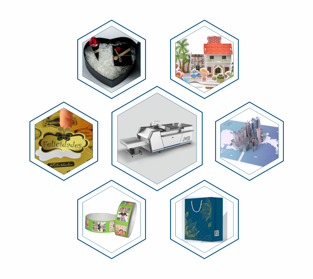 经纬割样机应用于图文印刷及广告包装行业,尤其是在数码快印图文店普及,进行各类产品打样以及小批量生产,如行业标书、产品画册、请柬贺卡、不干胶贴纸、毕业相册、个性台挂历、电子产品包装、食品包装、日用品包装等;