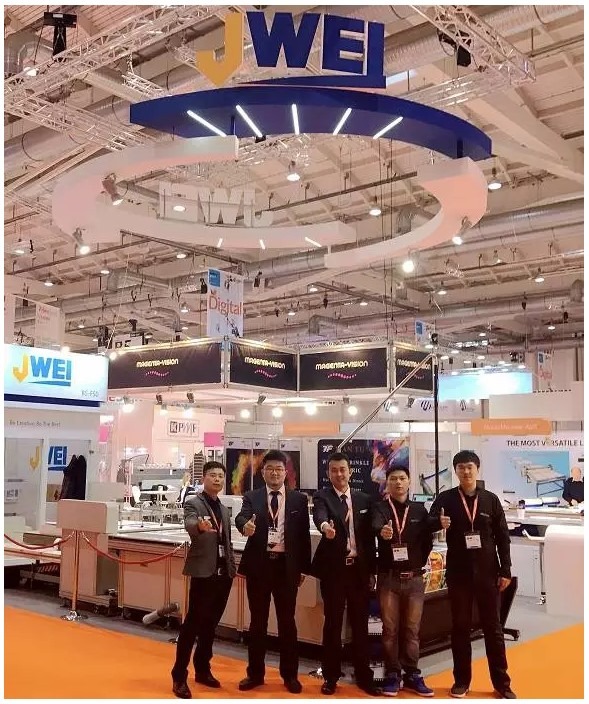 分享会上特别说到一位叫Mark的客户,数年前科隆FESPA展会就已相识,之后在阿姆斯特丹,在拉斯维加斯等多地多个展会,都有见过面,客户一直在关注经纬设备。今年在汉堡,Mark又来到经纬展台,对Frank说(全程英文交流),大概意思是你们这次展会设计很漂亮,设备做得也越来越精致了。在新款CB03II设备旁,Mark边看他手机屏幕边对比眼前的设备,说起了一个秘密,他手机里有一个匈牙利朋友发给他的一张设备照片,是一款去年年底新购的CB03II型经纬设备,可以自动送料,自动调用切割文件,自动切割材料,自动收料,操作